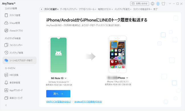 以下は、AnyTransを使用してAndroidからiPhoneにLINEトーク履歴を移行する手順です。