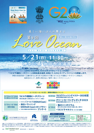 NPO法人リビエラ未来創りプロジェクト(神奈川県逗子市 理事長 渡邊華子、以下リビエラ)が主管するリビエラSDGsアクション実行委員会が「地球と子供たちの未来」のために呼びかける環境イベント『第4回LOVE OCEAN(会期:2023年5月13日~6月18日)』は、G20とのコラボレーションが決定しました。5月21日11:30に和田長浜海岸(神奈川県横須賀市/三浦市)で開催する「LOVE OCEAN~リビエラ湘南ビーチクリーン」が、G20議長国を務めるインドが呼びかけG20各国が参加する「メガ・ビーチ・クリーンアップ(世界一斉ビーチクリーン)」の日本会場となり、駐日インド大使館、日本国環境省とのタイアップイベントとして実施します。