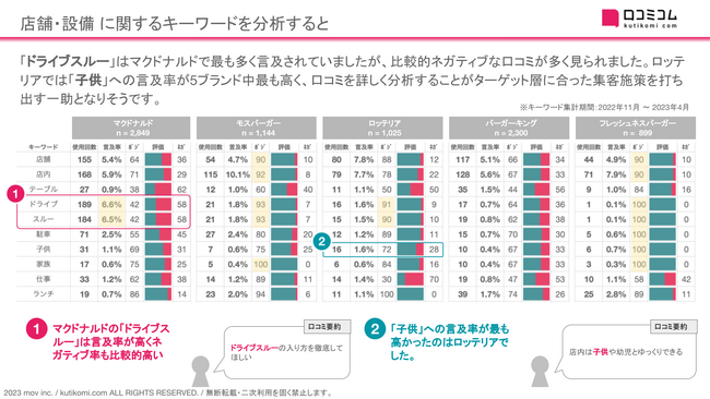「ドライブスルー」はマクドナルドで最も多く言及されていましたが、比較的ネガティブな口コミが多く見られました。ロッテリアでは「子供」への言及率が5ブランド中最も高く、口コミを詳しく分析することがターゲット層に合った集客施策を打ち出す一助となりそうです。