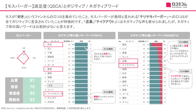 モスが「好き」というファンからの口コミを集めていたこと、モスバーガーが発祥と言われる「テリヤキバーガー」への口コミが全てポジティブに言及されていたことが特徴的です。