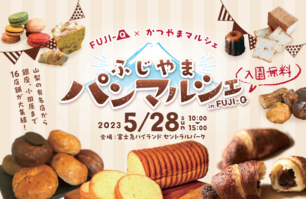 入園無料の富士急ハイランド(山梨県富士吉田市)では、富士山周辺の道の駅を中心に活動している「かつやまマルシェ」とタッグを組み、有名ベーカリーやお菓子屋さん16店舗が大集合する「ふじやまパンマルシェ」を、2023年5月28日(日)に開催いたします。