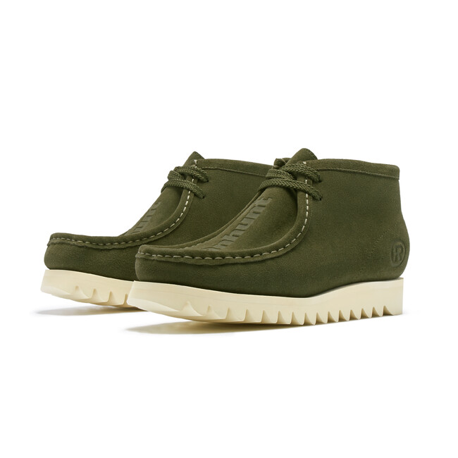 ブラウンとオリーブのスウェードアッパーとシャークソールが個性を引き立てる一足。