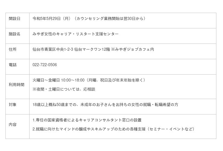 宮城県が設置している「みやぎ若年者就職支援センター(通称: みやぎジョブカフェ)」内に女性のための再就職等支援施設「みやぎ女性のキャリア・リスタート支援センター」を開設し、キャリアコンサルティング業務など各種就職支援業務や仕事と子育ての両立に向けた「働き方改革」に関する啓発事業などを実施します。