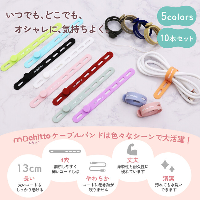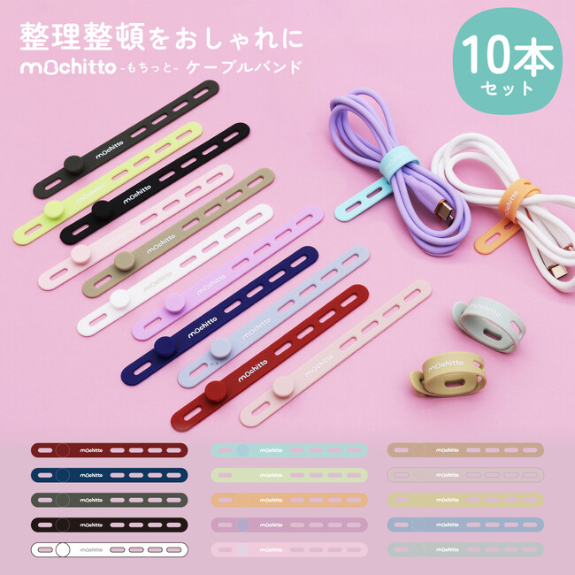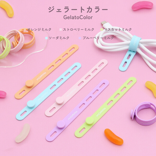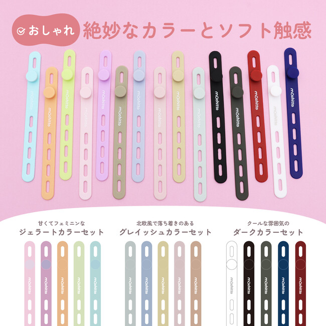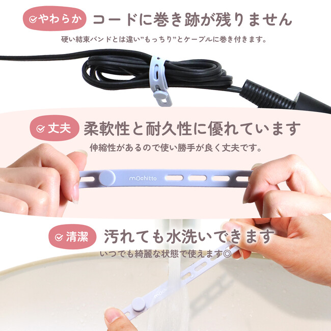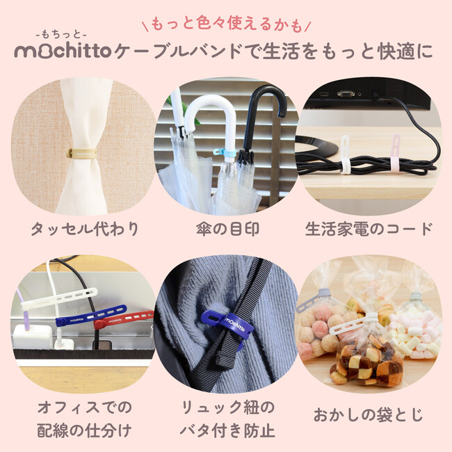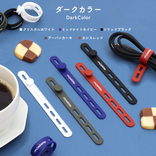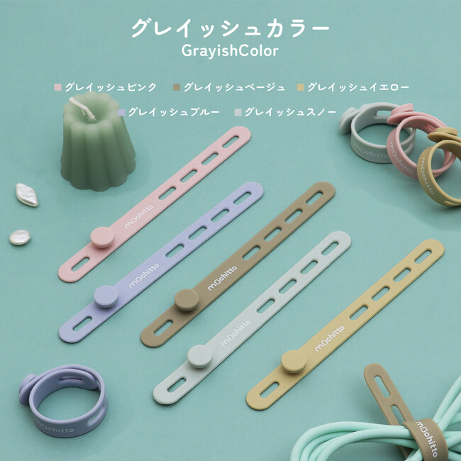くすみカラーなど可愛いカラバリが評判の【mochitto -もちっと-】ケーブルバンド発売!PC配線やドライヤー等の電源コードをまとめ、パンの袋とじやアンブレラマーカーにも使えます。もちもちシリコン製