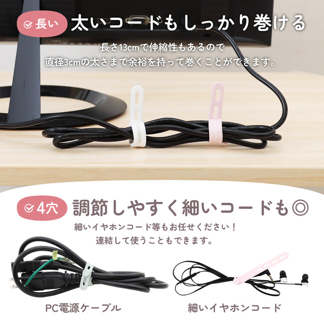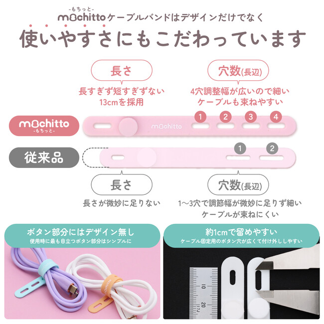 一般的なシリコンバンドは1~3穴のものが多く、細いケーブルや太いケーブルの場合対応できないことも。もちっとは細い・太いケーブルに対応するために穴を4つに設定しています。