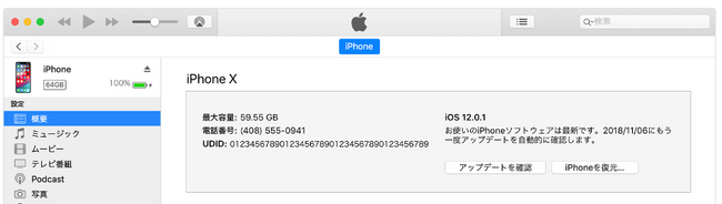 Step3: iTunesへ接続出来たら、iTunesウィンドウの左上にiPhoneのマークをが表示されます。そこからiPhoneの画面へ進むと以下のように「アップデート」と「iPhone復元」の選択肢が表示されます。