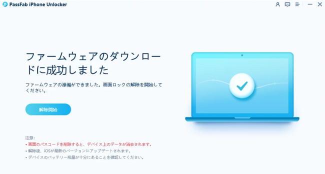 Step3:ダウンロードが完了すると以下の画面のように「解除開始」の項目が表示されます。「解除開始」をクリックして作業を進めましょう。解除作業中、iPhoneはロゴのマークが表示されます。