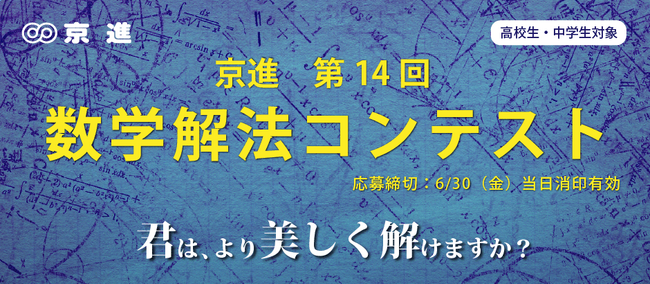 京都・滋賀・愛知を中心に学習塾を展開する京進は、数学への関心が高い全国の中学生・高校生のためのイベント「第14回 京進 数学解法コンテスト」を開催、2023年5月15日より応募受付を開始いたしました。このコンテストは大学入試とは一味違う、ひとつの解答を導き出す数学の解法の美しさと華麗さを競います。京進ではコンテストを通じて、数学を学ぶ意欲と楽しさ、好奇心を高める機会としてもらい、将来の夢・実現につなげてもらうことをねらいとしています。審査は、京進の大学受験TOPΣの数学科顧問でコンテスト作問担当講師が行い、7月に入賞者発表とオンラインでの表彰式を行います。応募にはエントリーが必要で、6月23日までにホームぺージからお申込みください。