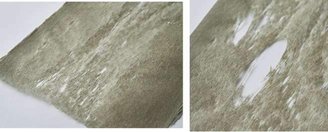 つめかえパックリサイクルの実現に向けては、つめかえパックを構成する素材のうち、約80%を占めるポリエチレンの性質を活かし、その他不純物となるPET、ナイロン、アルミ箔、インク等の影響をおさえる必要がありました。当初、使用済みつめかえパックを再度フィルム化する工程のなかで、つめかえパックに含まれるアルミ箔やインクなどが粉砕しきれず異物として残ってしまい、それによってフィルムに孔(あな)があいてしまうという課題がありました(図)。そこで、アルミ箔が含まれるつめかえパックを選別工程であらかじめ除き、リサイクルすることで、フィルム化工程で孔があく原因となる異物の低減につなげました。さらに、ポリエチレンとPET、ナイロンなど、互いに混ざりあわない素材を混ざりやすくするために、相溶化剤を添加し細かく分散させることや、インクや接着剤をフィルム化工程で悪影響をおよぼさない程度まで細かくすることにより、孔のない均質なフィルムとすることができました。しかし、製品化に向けて容器の基材面に印刷を施すと、ごくわずかな凹凸が顕在化する事がわかりました。この凹凸は、外観性や、容器の機能を担保するうえで課題があると考え、さらなる技術開発を行いました。