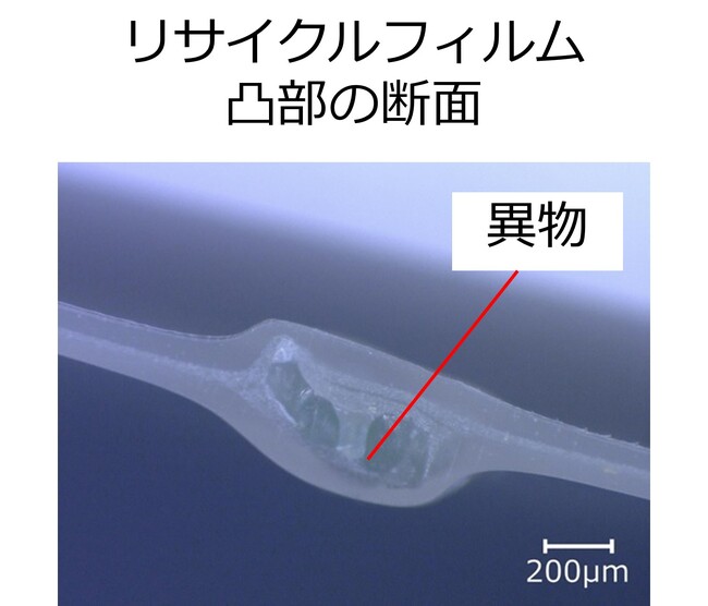 つめかえパックの主な素材であるポリエチレンと、PET、ナイロンは、それぞれ溶解温度が異なります。そのため高温すぎると水平リサイクルに必要なポリエチレン素材の性質を損なう一方、低温ではPET、ナイロンなどの不純物の溶解が不十分となり、凝集、肥大化し、フィルム化の際の凹凸の原因となる、異物の発生につながります。新技術では温度を最適化することにより、素材の性質を保ちながら、凝集の発生を抑制できるようになりました(株式会社フジシールとの共同開発)。