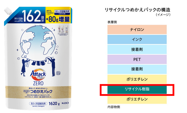 この技術を採用し、2023年5月29日から順次発売する『アタック ZERO つめかえ用(1,620g)』では、リサイクルつめかえパックのうち、約1%が回収した使用済みつめかえパック由来、残り約9%は、製品として使用されなかったつめかえパック由来、計約10%のリサイクルした素材を使用して製品化しました。リサイクルした素材は、リサイクルつめかえパックの中間層の一部(右図)に使用し、内容物の品質を担保するとともに、容器の強度を確保しています。