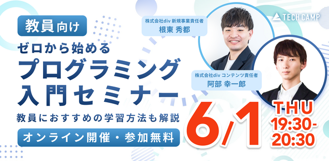 プログラミングスクール「テックキャンプ」を運営する株式会社div(本社:東京都 渋谷区、代表取締役社長 石原 圭、以下「div(ディブ)」は、学校の教員を対象としたゼロから始めるプログラミング入門セミナーを開催いたします。