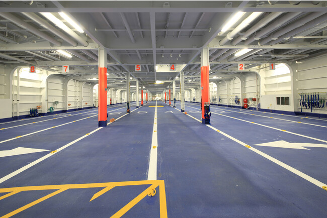 航路や車両甲板、ドライバールーム・専用レストラン・専用浴室等のトラックドライバー専用施設、電力供給設備の詳細について、紹介しています。