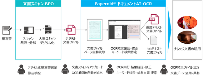 当社グループが提供する紙文書のスキャニングプロセスをアウトソーシングできる文書スキャンBPOと、あらゆるフォーマットから文字箇所を定義せずにOCRすることが可能なTISのPaperoid(R)の「ドキュメントAI-OCRサービス」を組み合わせ※1一気通貫でご提供します。