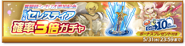 株式会社マーベラス(代表取締役社長:佐藤 澄宣/所在地:東京都品川区)は、スマートフォン向け本格オンラインRPG『剣と魔法のログレス いにしえの女神』において、2023/5/24(水)にシナリオ「めぐり逢ひて」中巻の配信、および「ジョブ別 異聞録シナリオ追加記念スペシャルガチャ」「ジョブ別 セレスティア確率3倍ガチャ」の販売を含むアップデートを行ったことをお知らせいたします。