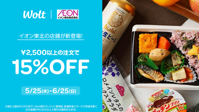 デリバリーサービス「Wolt(ウォルト)」を展開するWolt Japan株式会社(本社:東京都渋谷区、代表:野地春菜、以下 Wolt)と、東北6県でスーパーマーケットを運営するイオン東北株式会社(本社:秋田県秋田市、代表取締役社長:辻 雅信、以下イオン東北)は、2023年5月25日のマックスバリュ盛岡津志田店でのサービス開始に続き、仙台、青森と東北3県でサービス開始いたします。マックスバリュ盛岡津志田店はイオン東北として岩手県内のWolt初出店、6月2日にサービス開始するイオン青森店は、青森県内でWolt初のスーパーマーケットの出店となります。青森エリアの皆様に、料理だけではなく生鮮食品や食料品、日用品も、ご注文から30分程度でお届けすることが可能となりました。サービス開始を記念して、お得なキャンペーンも実施いたします。