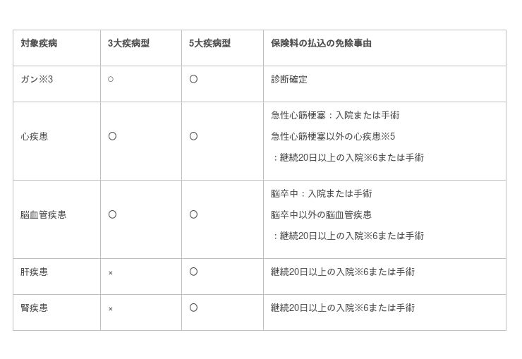 3大疾病(ガン※3、所定の心疾患または所定の脳血管疾患)または5大疾病(ガン※3、所定の心疾患、所定の脳血管疾患、所定の肝疾患または所定の腎疾患)を直接の原因として所定の事由に該当したとき、以後の保険料の払い込みが免除されます。