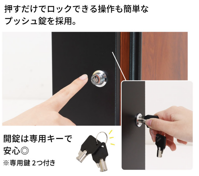 他のポストでよく使用されるダイヤル式鍵に代わり、頑丈かつ簡単にロックできるシリンダープッシュ錠を採用しました。ダイヤル式鍵の欠点である暗証番号の忘れ、不正解錠や開けるまでに時間がかかるなどがなく、簡単操作と防犯性で安心感を提供します。