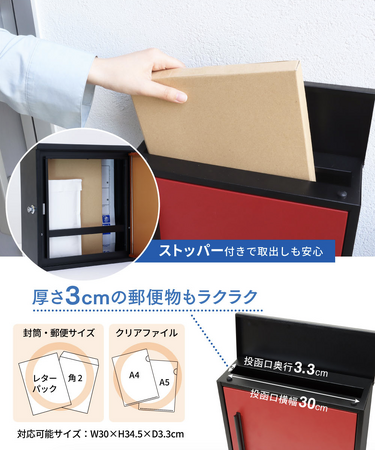 投函口の奥行き3.3センチもあり、レターパックなどの大型郵便物も簡単に収納できます。 再配達や呼び出しのストレスから解放されることでしょう。