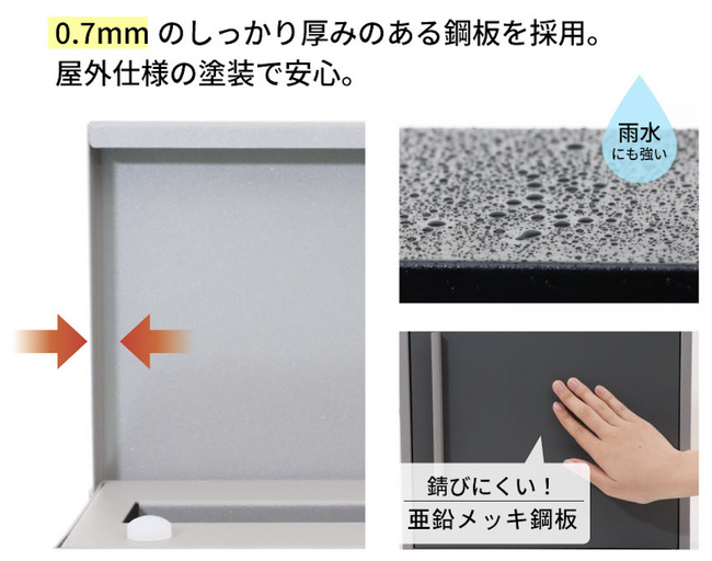 0.7mmの亜鉛メッキ鋼板を使用し、屋外でも安心してご利用いただける耐久性も備えています。