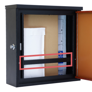 前面には大きく開く取り出し口が設けられており、大きな投函物の取り出しも楽にできます。また、取り出し口には落下防止バーが装備されているので扉を開けた際に投函物が落ちる心配もありません。