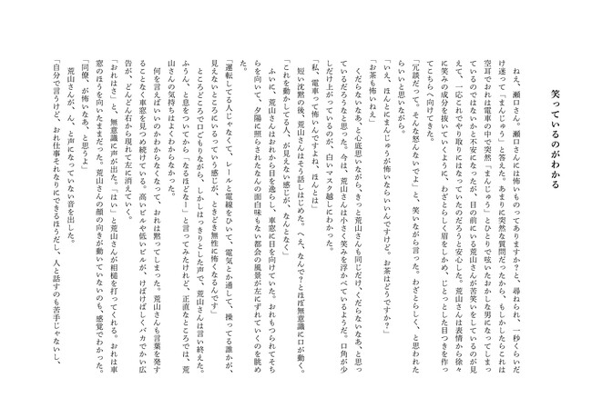 見えない何かが目の前の当たり前を動かしていることへの漠然とした恐怖など若い感性が文学的情感をもって表現されていると感じました。構成の面でも、導入の古典落語が単なる引用に留まらず、現代という時間軸を意識する装置として作品の時代性をより立体的に浮かび上がらせています。なにより都会を走る電車の中から生まれた「旅」という風景のジャンプが、「見えないものは怖い」という価値観から「見えないのに笑っている」という逆転に接続している点が見事です。