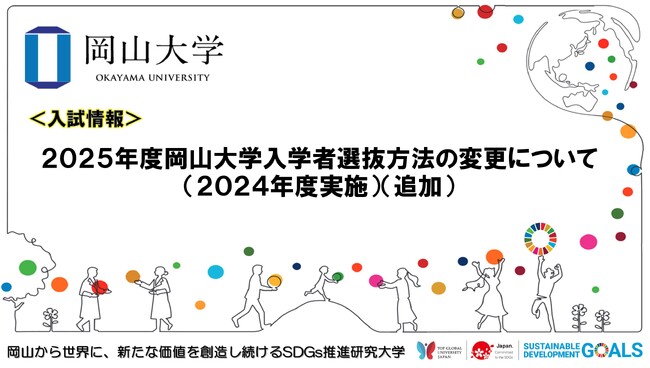国立大学法人岡山大学(本部:岡山市北区、学長:那須保友)では、2025年度岡山大学入学者選抜方法の変更について(2024年度実施)、以下の通り公開しましたので、お知らせします。