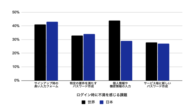また、ログイン時の煩わしいユーザー体験も消費者に不満を抱かせています。世界の回答者41%(日本43%)は、サインアップ時の長い入力フォームに煩わしさを感じ、44%(日本29%)が個人情報や機密情報を入力することに抵抗を感じています。