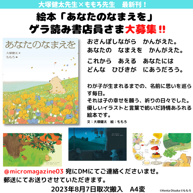 マイクロマガジン社(東京都中央区)は、2023年8月刊行予定の新作絵本『あなたのなまえを』のゲラ(校了前の原稿)を読んでくださる書店員さんを募集しております。