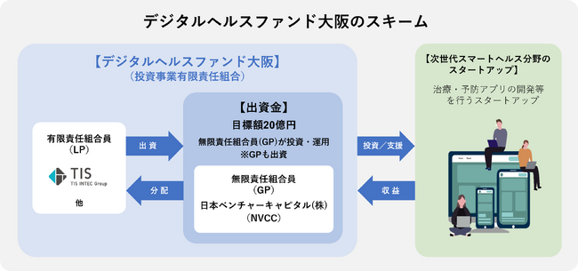 TISインテックグループのTIS株式会社(本社:東京都新宿区、代表取締役社長:岡本 安史、以下:TIS)は、日本ベンチャーキャピタル株式会社(本社:東京都千代田区、代表取締役社長:多賀谷 実、以下:NVCC)の運営するファンド「デジタルヘルスファンド大阪」へLP(Limited Partner:有限責任組合員)※1 として出資したことを発表します。