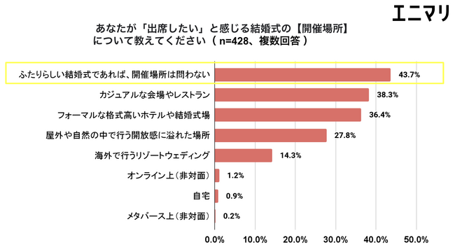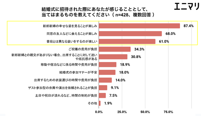 ※関連プレスリリース:【結婚式に参加するゲストの本音】 Web招待状は9割、オンラインご祝儀は5割が支持! 「手軽さ」へのニーズが浮き彫りに~エニマリが結婚式に参加するゲストの本音調査を実施~