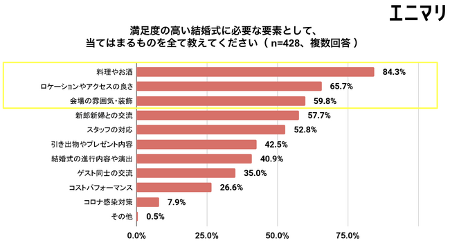 満足度の高い結婚式に必要な要素:8割強が「料理やお酒」、次いで「ロケーションやアクセスの良さ」、「会場の雰囲気・装飾」