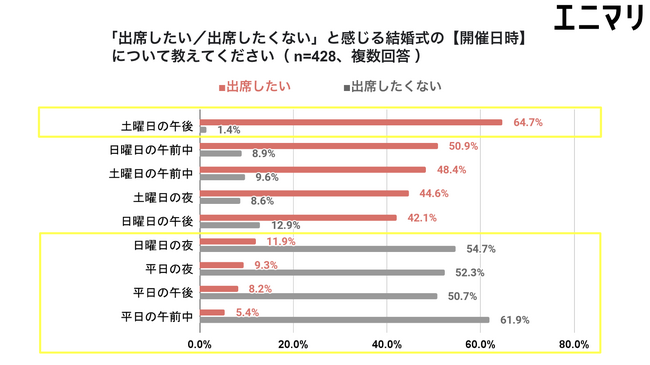 出席したい開催日時は、「土曜日の午後」が64.7%で最も好まれることがわかりました。一般的に多くのゲストが土曜日は休みであり、午後の結婚式であれば身支度などの時間に余裕もあると考えられます。次いで、「日曜日の午前中」50.9%、「土曜日の午前中」48.4%などが続きました。