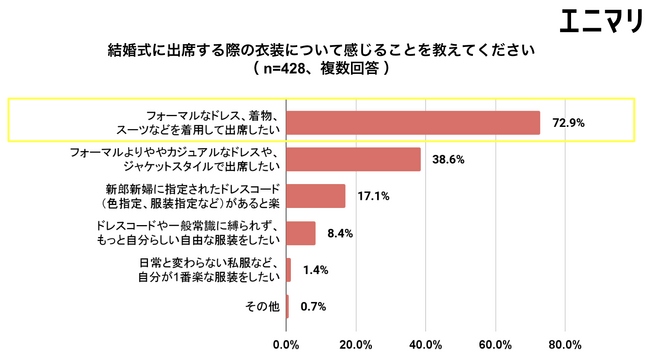 また、結婚式に出席する際の衣装について聞いたところ、「フォーマルなドレス、着物、スーツなどを着用して出席したい」が7割以上で圧倒的に多いことからも、普段とは異なる、格式のある装いを好んで着用している方が多いことがわかりました。