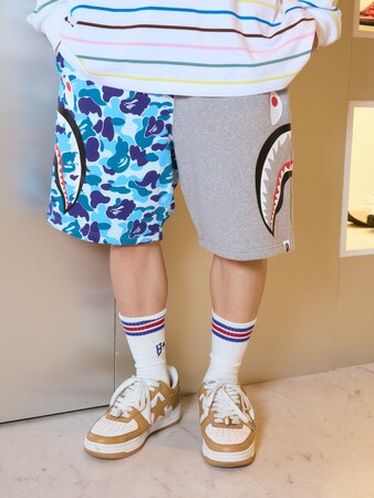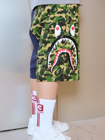 「ABC CAMO SIDE SHARK SWEAT SHORTS」は、「ABC CAMO」と切り替えたアシンメトリーな配色が一段と目を引くデザイン。