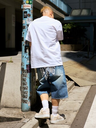 「NYC LOGO DENIM SHORTS」は、一般的な厚さである13oz.のムラ糸デニム素材を使用したデニムショーツ。背面にNYCロゴ風にアレンジしたブランドロゴをプリントしています。