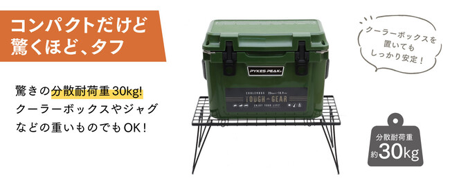 軽量・コンパクトなのに驚くほど、タフ。ジャグやクーラーボックスも置ける耐荷重30kg!地面に直置きしたくなかった重量物も気軽に置けます。【気配り設計】脚は折りたたみ式で初心者も簡単組立!収納時は脚をたたんだときに垂れ下がってこないストッパー付き
