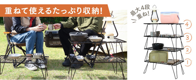 組み立て簡単、脚を開いて留めるだけ!あとはお気に入りのキャンプグッズを自由にラックに配置して、しかも2段、3段、4段と重ねて使えて、小物もおしゃれに配置すれば自分だけの快適なキャンプサイトを簡単に作れます。棚としてだけではなく、テーブルや水切り台としても使うことができ、いろいろなシーンで活躍するキャンプの必需品です。