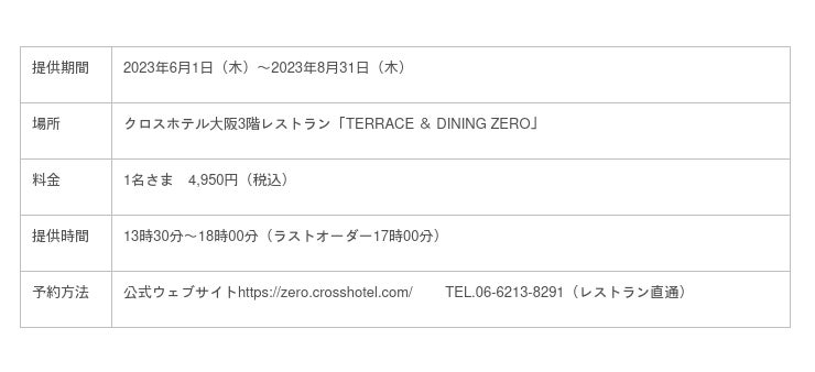 クロスホテル大阪(所在地:大阪市中央区、総支配人:若山 智)のレストラン「TERRACE & DINING ZERO」では、2023年6月1日(木)から8月31日(木)までの期間、トロピカルをテーマにしたアフタヌーンティー「Tropical Afternoon tea featuring Mango」をご提供します。