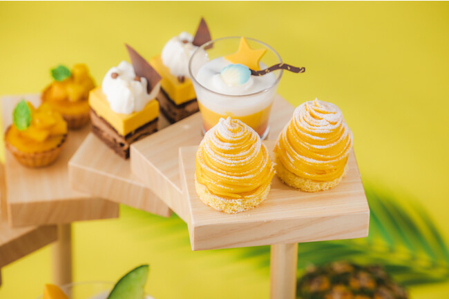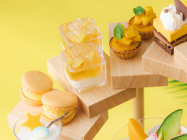 メロンブラン・マンジェ / マンゴープリン / マンゴーモンブラン / マンゴータルト / マンゴーショコラ / マンゴーマカロン / カットフルーツ5種(マンゴー、ランブータン、ドラゴンフルーツ、パパイヤ、メロン) / スコーン(クロテッドクリーム、マンゴージャム)