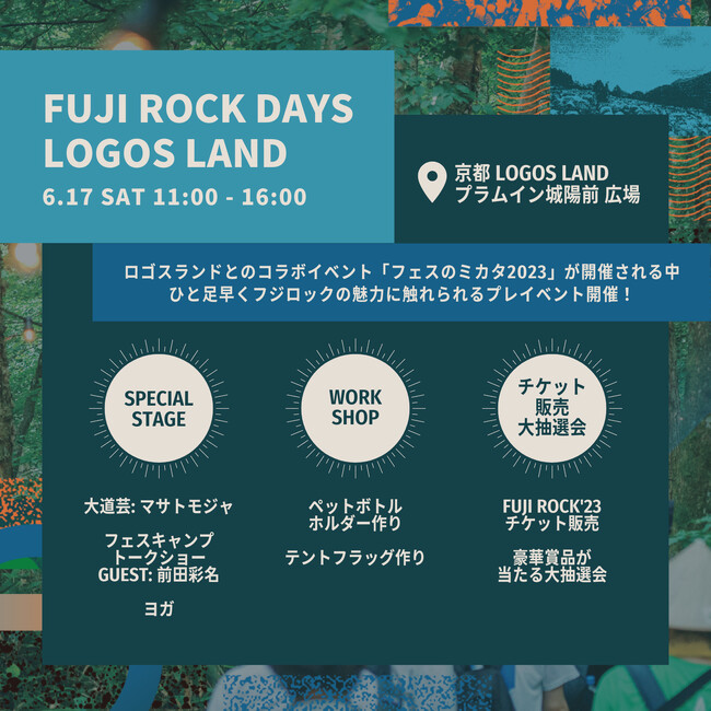 アウトドアブランドのLOGOS(本社:大阪市住之江区、代表取締役社長:柴田茂樹)が展開する総合アウトドアレジャー施設『ロゴスランド』は、国内最大級の野外ロック・フェスティバル「FUJI ROCK FESTIVAL」(主催:SMASH Corporation)とコラボレーションし、1日限りのスペシャルイベント「FUJI ROCK DAYS at LOGOS LAND」を、2023年6月17日(土)に開催いたします。