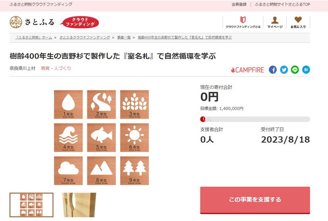 奈良県川上村とふるさと納税ポータルサイト「さとふる」(https://www.satofull.jp/)を運営する株式会社さとふる(本社:東京都中央区、代表取締役社長:藤井 宏明)は、「さとふるクラウドファンディング」(https://www.satofull.jp/projects/top.php)にて、「樹齢400年生の吉野杉で製作した『室名札』で自然循環を学ぶ」の寄付受け付けを2023年6月1日より開始します。