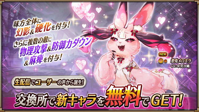 「恋兎メロミラ」は2022年夏の公式配信内の企画「新キャラテーマ会議」にてユーザーの皆さまからいただいた声をもとに生まれた新キャラです。昨年の6周年記念キャラ「レビン」に続き、イベント報酬キャラとしては破格となるスキル効果を所持!高難度コネクトでも大活躍します。