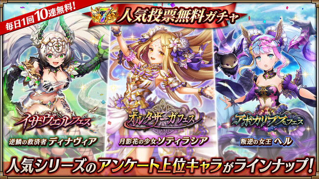 毎日10連無料ガチャ開催!アンケート上位キャラがラインナップ!