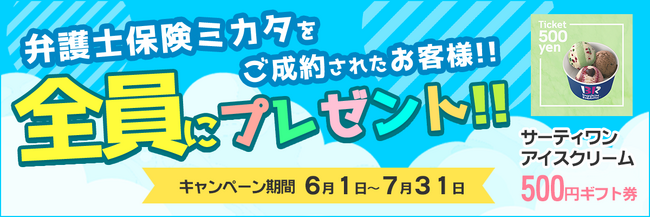 対象期間中に弁護士保険STATION経由で、ミカタ少額短期保険株式会社「弁護士保険ミカタ」の契約申込を完了し、ご契約が成立されたお客様全員に、「サーティワン アイスクリーム 500円ギフト券」をプレゼントします。(ご成約キャンペーン特設サイト https://bengoshi-h.info/campaignmikata2/ )