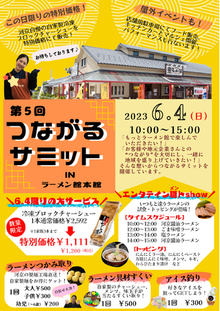 株式会社河京エンタテインメント 会津喜多方ラーメン館本館(本社:福島県喜多方市、取締役社長:土屋充孝)は、河京工場直送のラーメンつかみどり、地元のお店の人気フード販売なども行う「第5回つながるサミット」を2023年6月4日(日)に開催致します。