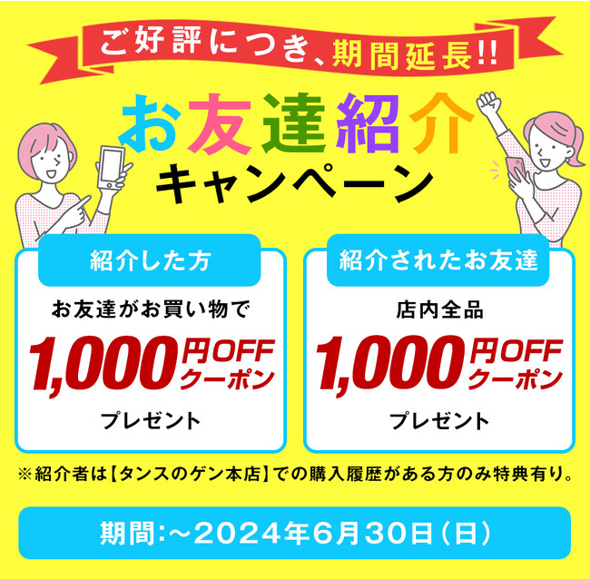 紹介する方と紹介される方のどちらにも1000円クーポンをプレゼント!タンスのゲン本店でお得に買える“お友達紹介キャンペーン”が再始動。