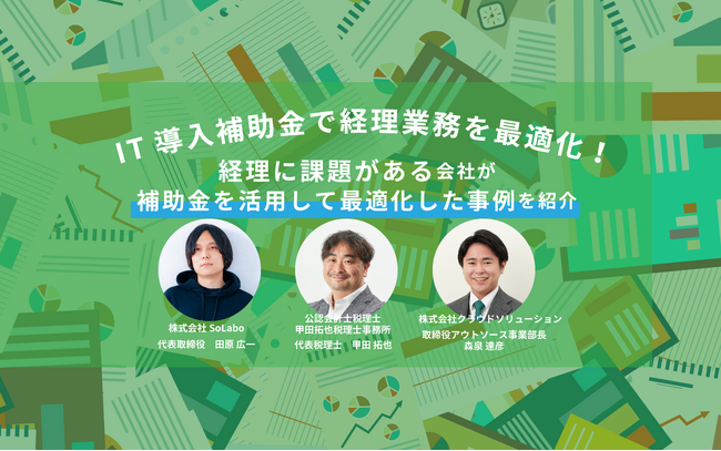 株式会社SoLabo(本社:東京都千代田区、代表取締役:田原広一)は、公認会計士税理士甲田拓也事務所および同事務所の関連会社である株式会社クラウドソリューション(両者とも 本社:東京都新宿区、代表者:甲田拓也、以下甲田拓也事務所グループ)と共同で、経理部門における業務改善をテーマとした無料セミナーを開催いたします。