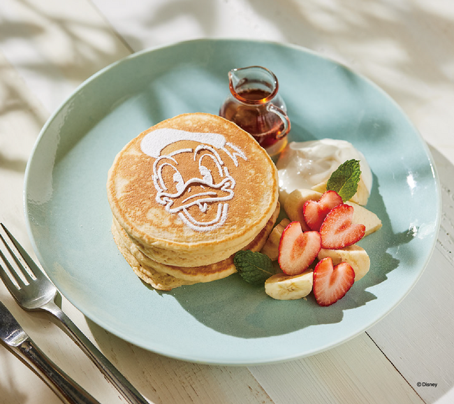 オートミール入りのパンケーキは、一面ドナルドダッグのフェイス柄をデザイン。季節のフレッシュフルーツとヨーグルトクリーム、メープルシロップと合わせてお召し上がりください!!※横浜赤レンガ倉庫限定