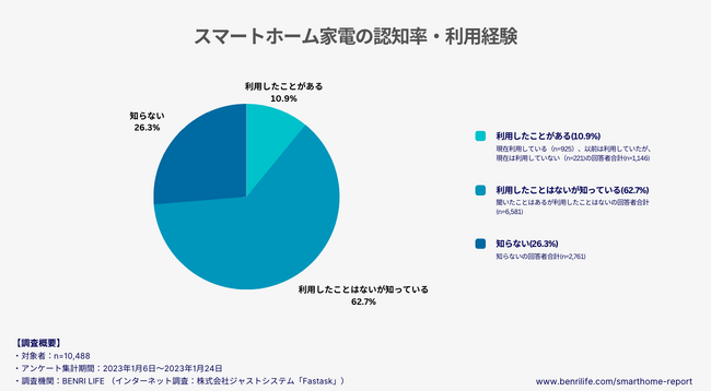 「BENRI LIFE(ベンリライフ)」が、日本全国の10代~60代の男女10,488名を対象に、スマートホーム家電に関するインターネット調査を実施したところ、認知率は、2023年時点で73.6%と8割に迫る勢いとなったことがわかりました。